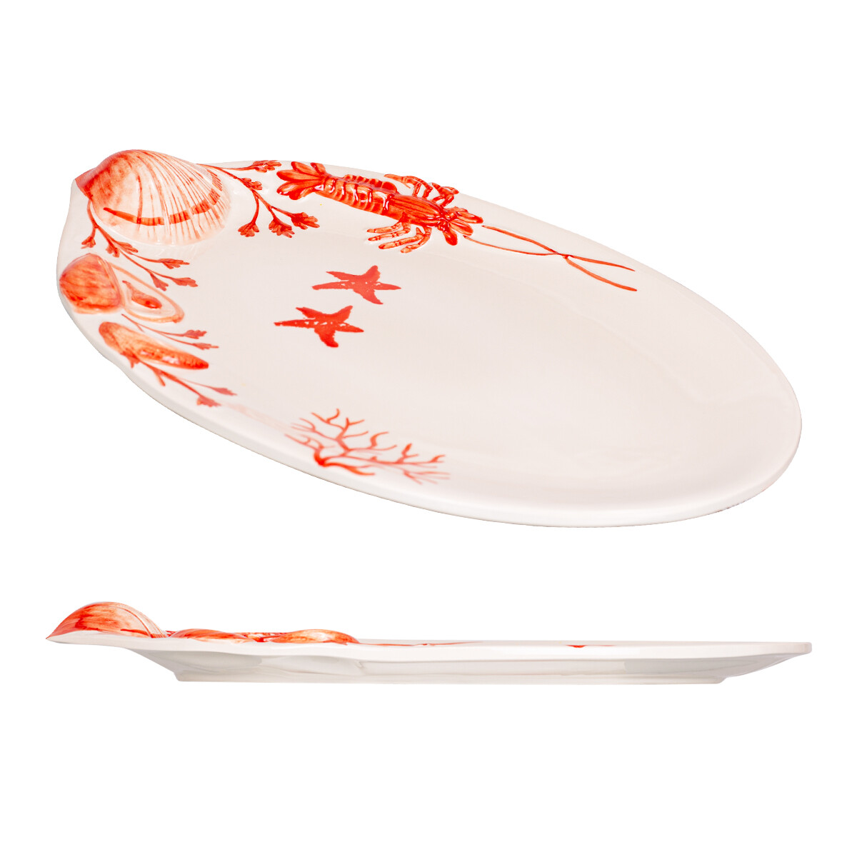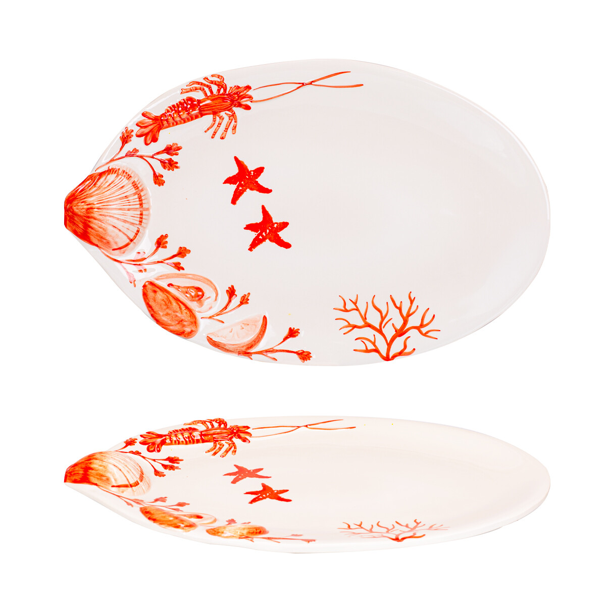 Loreo – je pozvánkou na hostinu priamo na slnečnom pobreží Stredozemného mora. Tento jedinečný keramický podnos je navrhnutý pre milovníkov darov mora, čo podčiarkuje jeho fascinujúci dizajn s ručne maľovanými červenými hviezdicami, koralmi a výraznou plastickou mušľou. Je to kúsok, ktorý premení každé podávanie jedla na zážitok – či už na ňom naservírujete grilovanú rybu, čerstvú paellu alebo morské plody. S podnosom Loreo prinášate na svoj stôl nielen funkčný riad, ale aj kus talianskej dovolenkovej atmosféry a poctivého remesla.