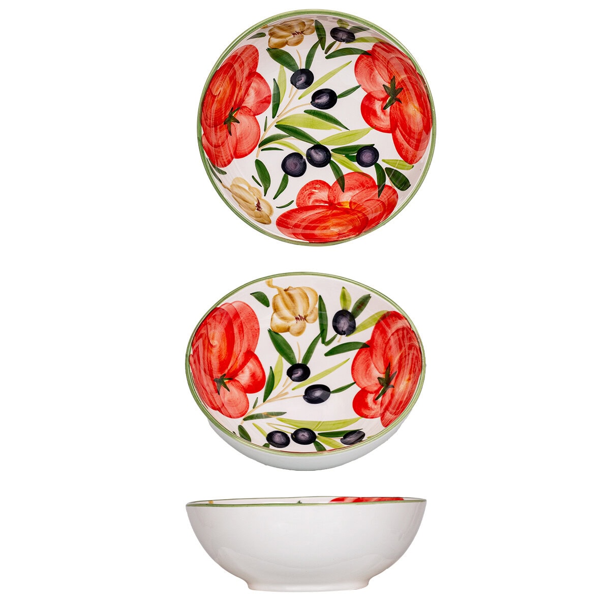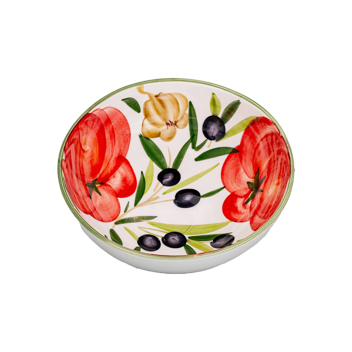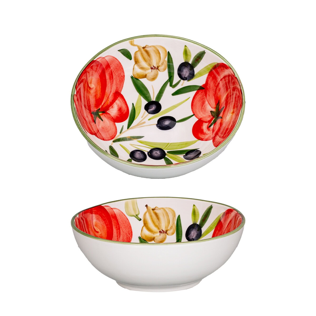 Medola – Táto stredne veľká univerzálna miska s priemerom 20 cm je oslavou tradičných talianskych chutí. Ručne maľované šťavnaté paradajky, modré olivy a aromatický cesnak vytvára nádherne pestrofarebný motív, ktorý oživí každý. Lesklá glazúra dodáva miske eleganciu a zaručuje jej životnosť. Ideálne na podávanie šalátov, cestovín či pochúťok, prinesieme do vašej kuchyne nádych slnečného Talianska.