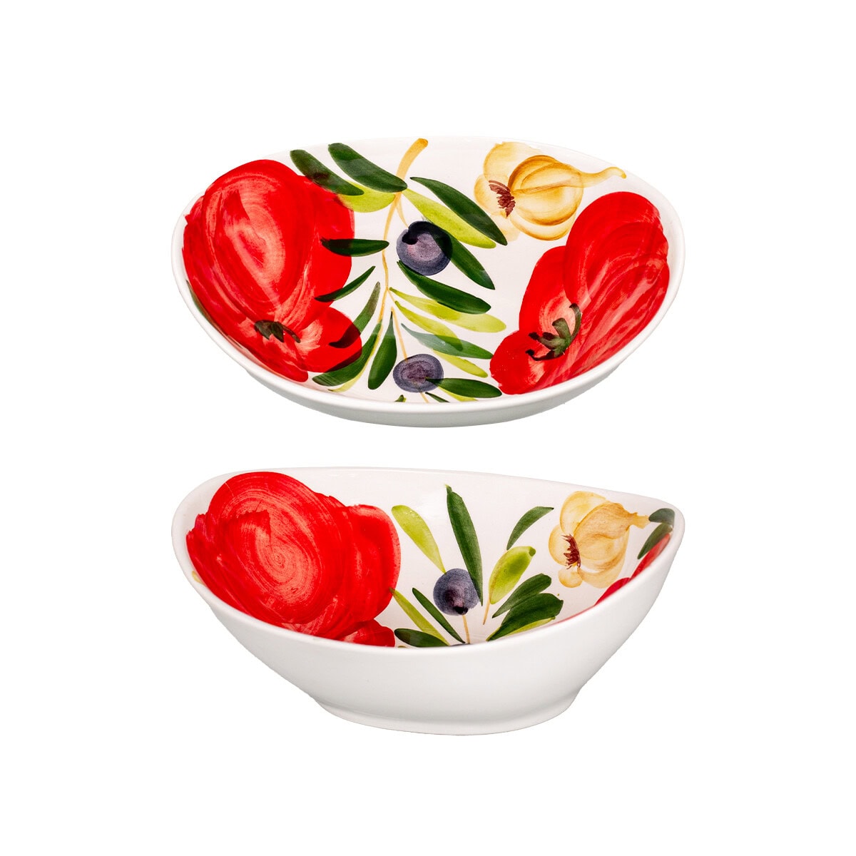 Neriva – tredne veľká oválna miska je ódou na taliansku gastronómiu a remeselnú krásu. Ručne maľované šťavnaté paradajky, modré olivy a cesnak vytvárajú živý, autentický motív, ktorý prináša do vašej atmosféry domova Stredomoria. Lesklá glazúra zvýrazňuje farby a dodáva eleganciu aj odolnosť. Ideálna na šaláty, cestoviny či pochúťky – s touto miskou si každý pokrm vychutnáte s nádychom stredomoria.