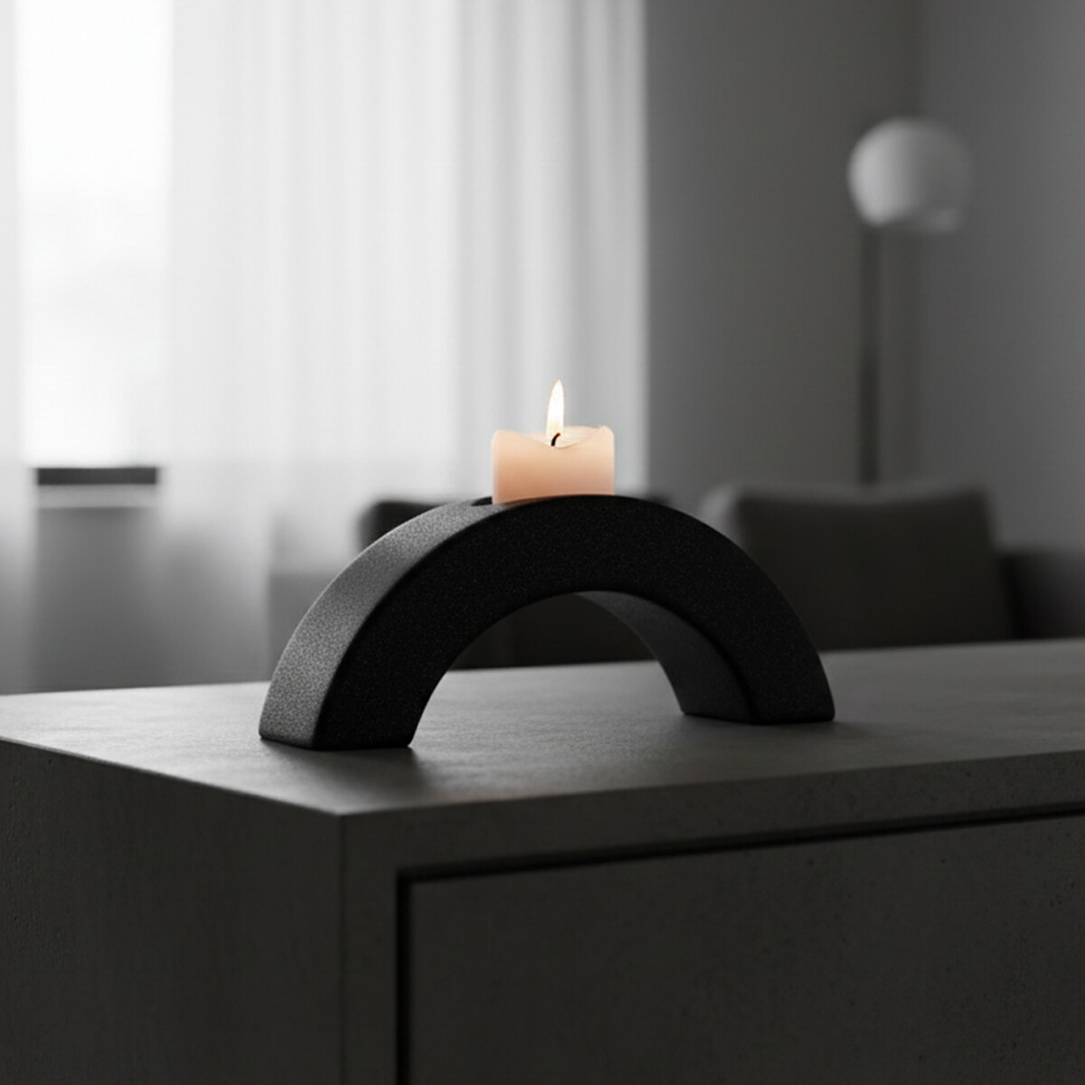PONTIS – Štýlový most pre vaše svetlo –  svietnik v tvare oblúka alebo mostíka pôsobí vďaka grafitovej farbe nesmierne moderne a architektonicky. Dodajte svojmu domovu moderný architektonický prvok so svietnikom Pontis. Jeho minimalistický tvar elegantného oblúka v hlbokej grafitovej farbe vytvára dokonalú základňu pre plameň sviečky. Jemný pieskový reliéf na povrchu odráža svetlo spôsobom, ktorý pripomína nočnú skalu pod hviezdami. Pontis nie je len podložkou pod sviečku, je to dizajnový most medzi funkčnosťou a moderným umením, ktorý okamžite pritiahne pohľad na každom stole či poličke.
