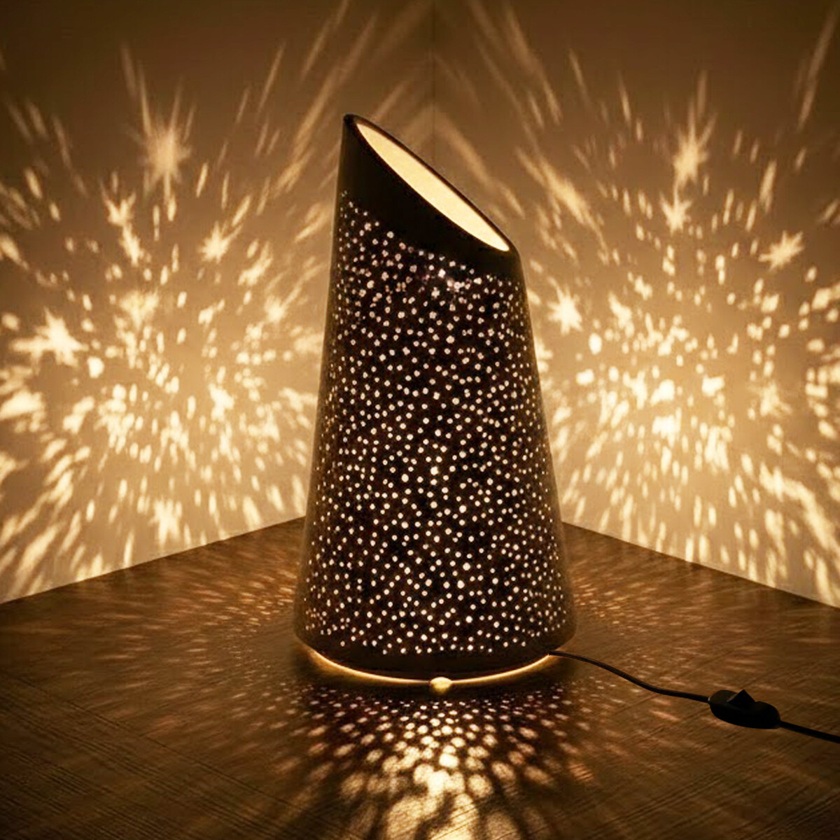 Dizajn,možnosti a atmosféra - tento model je navrhnutý výhradne pre elektrické napájanie (závit E14), čo zaisťuje stále a jasné svetlo ideálne pre večerné čítanie či pokojné zaspávanie. Tisíce ručne vytvorených dierok premenia po rozsvietení steny na magickú hviezdnu oblohu, pričom jemné svetlo prechádzajúce keramikou upokojuje a hreje. MONAT nie je len obyčajná nočná lampa; je to svetlo s dušou, ktoré vytvára pocit bezpečia a rozprávkového pokoja. Výsledný svetelný efekt a intenzitu si môžete prispôsobiť výberom vhodnej žiarovky.