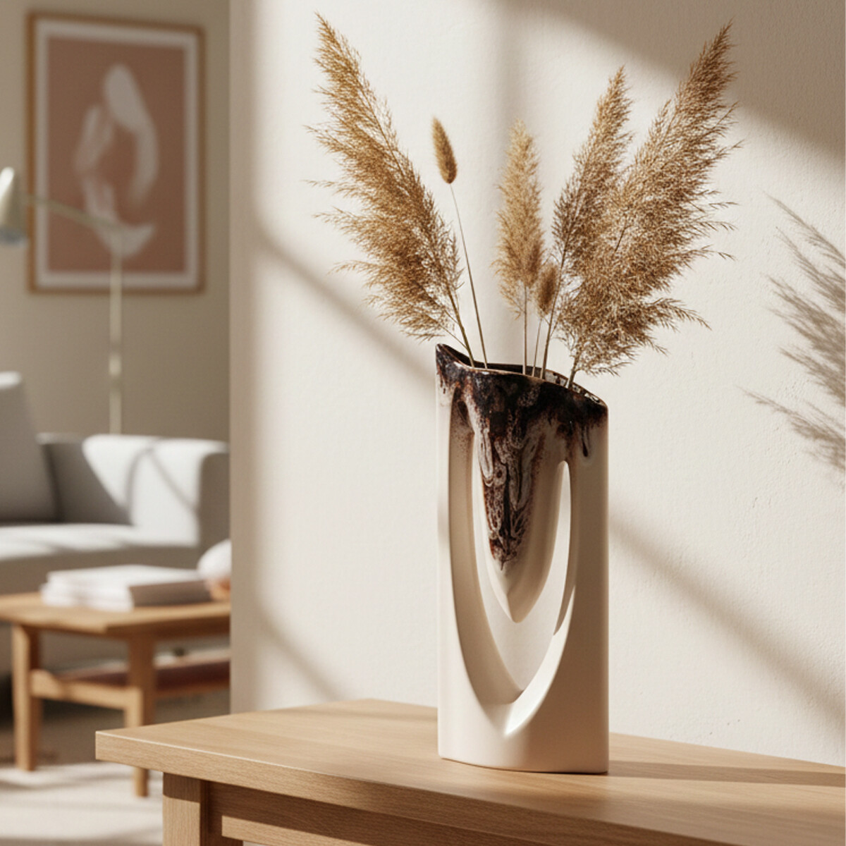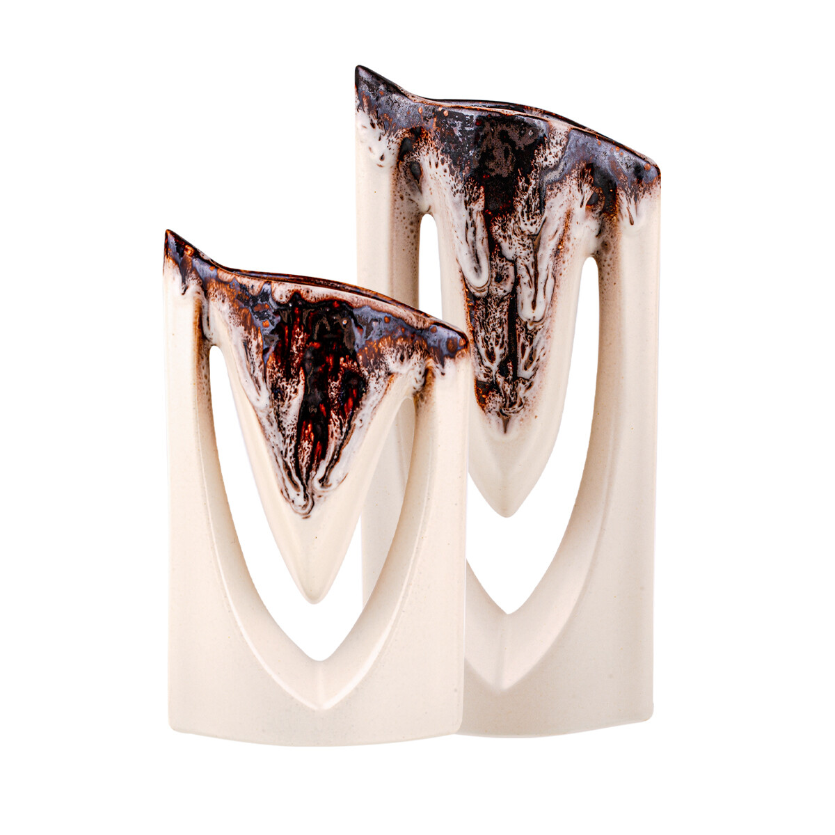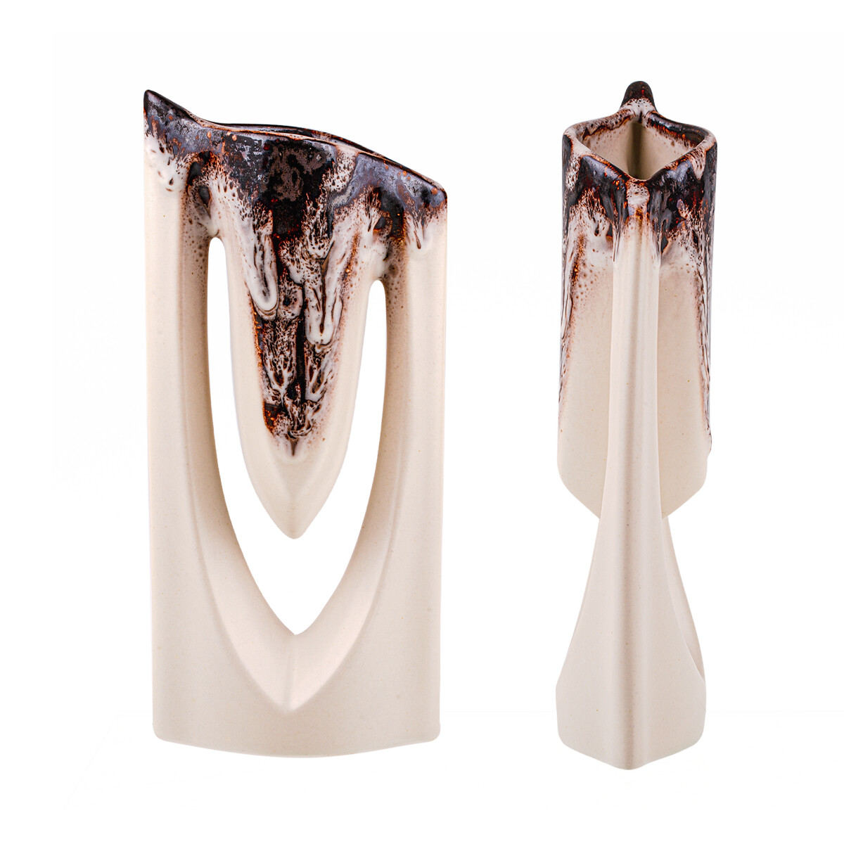 Príbeh a emócia – vneste do svojho domova energiu a moderný rast s vázou Zenit. Jej unikátny asymetrický tvar pripomínajúci víťazné písmeno „V“ alebo rozvíjajúci sa kvet dodáva interiéru okamžitý pocit dynamiky. Jemná krémová plocha v kombinácii s dramaticky stekajúcou hnedou glazúrou vytvára umelecký kontrast, ktorý podčiarkuje vertikálnu líniu vázy. Zenit je stvorený pre odvážne interiéry, ktoré sa neboja vystúpiť z radu a hľadajú rovnováhu medzi prírodným materiálom a avantgardným tvarom.