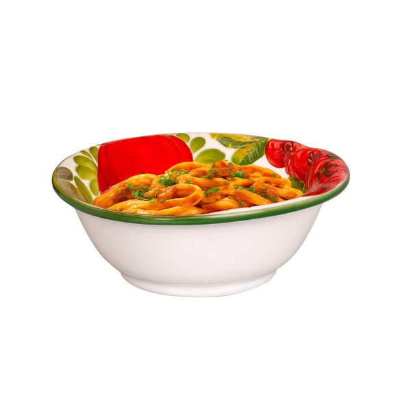 Hagesa - Táto hlboká keramická misa s výrazným motívom šťavnatých paradajok prinesie do vášho stola dotyk pravej talianskej vášne. Ručne maľovaný dizajn v žiarivých farbách dodá servírovaniu jedinečný šarm a eleganciu. Ideálna na cestoviny, polievky či šaláty, no zároveň krásna aj ako dekorácia. Misa, ktorá spája praktickosť s umeleckým spracovaním a prenesie vás priamo do srdca talianskej kuchyne.